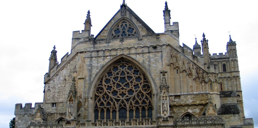 Exeter Cathedral in located in the city of Exeter off the M5 in Devon in southwest England.