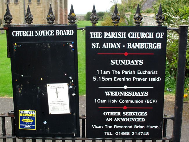Reader Board at Gate to St. Aidan's Church (Bamburgh), Northumberland, England (J. Demetrescu 2013)