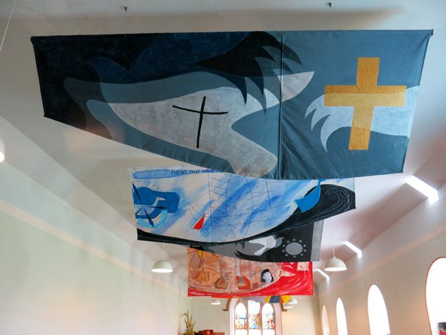 Banners Celebrating 900th Anniversary of St. Magnus' Maryrdom in St. Magnus Church (Birsay), Mainland, Orkney, Scotland