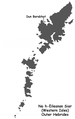 Dun Barabhat, near the far west coast of the Isle of Lewis in the Western Iles in Scotland, may be found in the hills above Traigh na Beirigh, a beach near the village of Bhaltos (Valtos), which is a peninsula off the B8011. To reach Loch Barabhat, park near the gate separating the common grazings of Cnip and Riof - the only gate across the road. Enter the grazings on the Cnip side keeping to the left; skirt the marsh and walk along the far side until you come to a valley with a large mill-wheel at its bottom end. Scramble up the valley passing three norse water-mills, and Loch Barabhat is at the top.