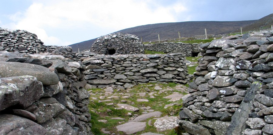 Also known as the Fahan Beehive Huts, Caher Conor (Cathair na gConchuireach) is located on the south side of Mount Eagle west of Dingle. The complex consists of five structures.