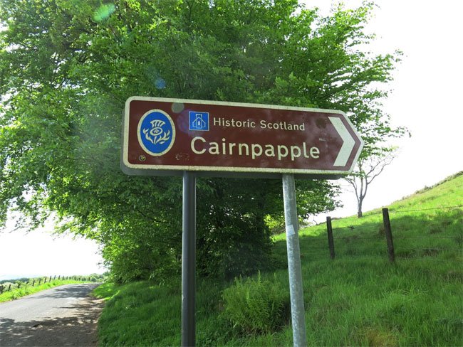 Roadside Historic Scotland Sign to Cairnpapple Hill Cairn and Henge, West Lothian, Scotland (J. Demetrescu 2022)