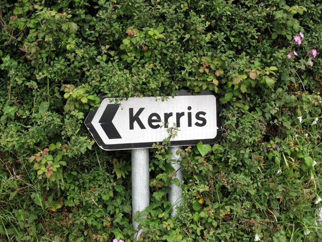 Road Sign for Kerris, Location of the Kerris Standing Stone, Cornwall, England (J. Demetrescu 2011)
