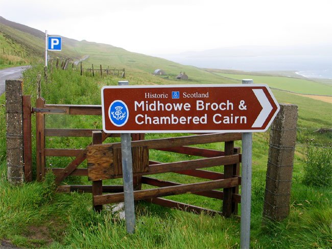Roadsign for Midhowe Broch and Chambered Cairn, Rousay, Orkney, Scotland (J. Demetrescu 2007)