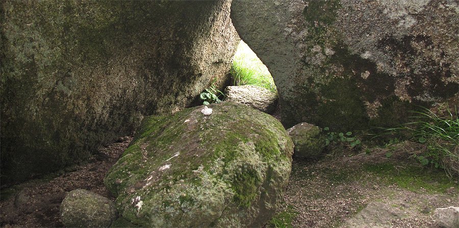 Mulfra Quoit is located on Mulfra Hill north of the hamlet of Newmill, which is north of Penzance. There is a small parking space just before a Public Footpath sign across the road from a house on the right. The slightly overgrown path leads to the top of the hill through the gorse where the quoit comes into view.
