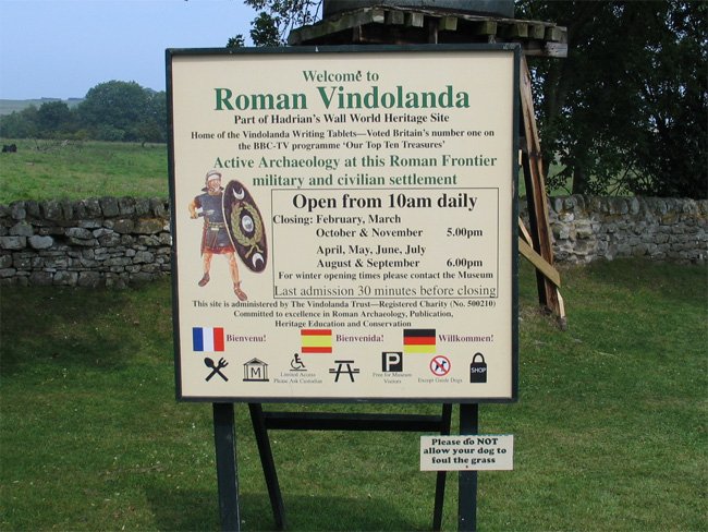 Welcome Sign at Vindolanda Roman Fort, Northumberland, England (J. Demetrescu 2004)