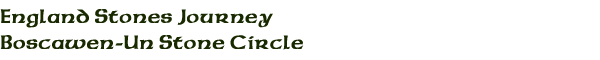 Boscawen-Un is located west of the village of Drift and south of the A30 in the West Penwith area of Cornwall. About a mile west of Drift, look out for a farm entrance for Boscawenoon Farm on your left. Drive a bit and park where it says no cars beyond this point. Walk on up to the farm and turn right. Follow the track and when the lane forks, bear right down a overgrown path. A gate to the stone circle lies ahead.Visited 2011