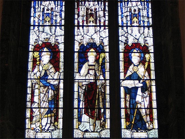 Stained-Glass Window Featuring Welsh Sts. Dyfrig, Deiniol, and Beuno, Bangor Cathedral, Gwynedd, Wales (J. Demetrescu 2009)