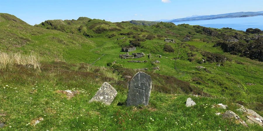 Standing in front of the beehives is a 12-foot stone pillar with a natural overhang called St. Columba's Pulpit. The later Christan monuments include a pair of churches, two graveyards, and domestic buildings including a kiln and barn. The earliest church is from the 11th Century, while the other is from the 14th Century. St. Columba is also said to have visited the island, and many believe that his mother Eithne is buried here. Her gravestone stands on the slope of the hill above the latter-day monastery, marked with a simple cross.