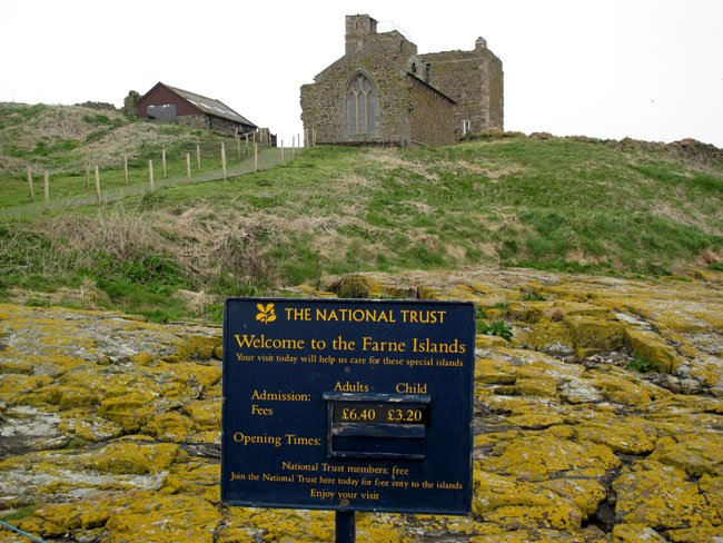 Welcome Sign and St. Cuthbert's Chapel (Above) on Inner Farne Island, Northumberland, England (J. Demetrescu 2013)