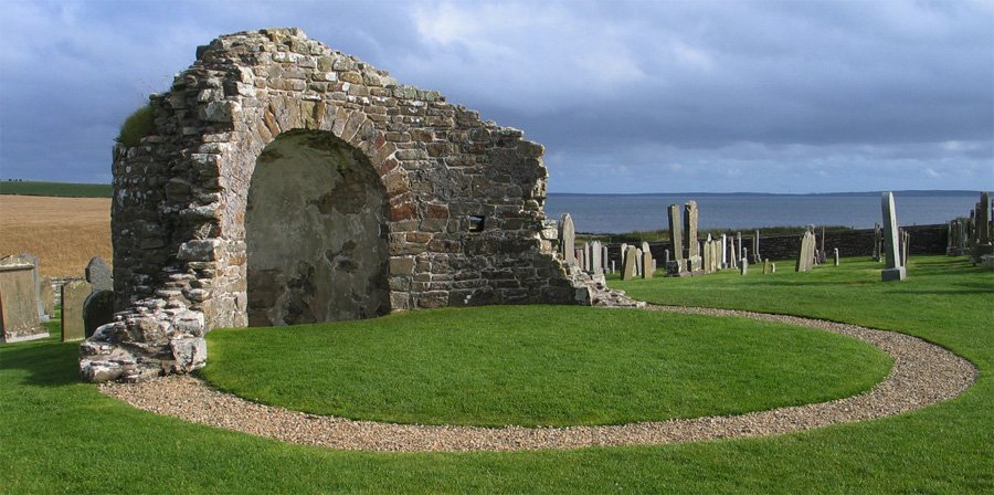 The Orphir Round Kirk, also known as St. Nicholas's Church, was built in about 1123 and is thought to have been modelled on the rotunda of the Church of the Holy Sepulchre in Jerusalem.