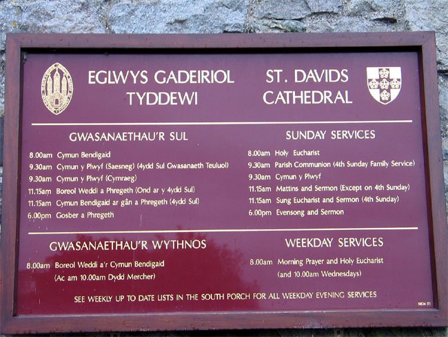 Reader Board Ouside St. David's Cathedral, Pembrokeshire, Wales (J. Demetrescu 2005)
