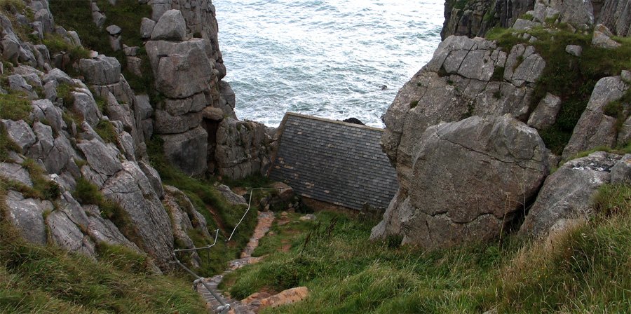 On St Govan's Head, near Bosherton in Pembrokeshire, St. Govan's Chapel is a small medieval church clinging to the ragged rock halfway down the cliffs of a secluded headland. Access is by way of 52 stone steps from the top of the cliffs.
