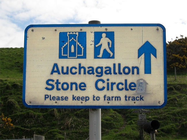 Sign for Auchagallon Kerbed Cairn at Start of Farm Track, North Ayrshire, Scotland (J. Demetrescu 2013)
