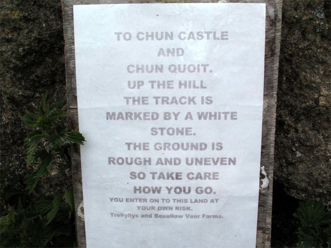 Sign on Stone on Path Uphill to Chun Castle and Chun Quoit, Cornwall, England (J. Demetrescu 2011)