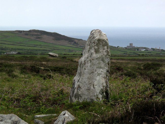 Standing Stone Outside Chun Castle Entrance and Chun Quoit in the Distance, Cornwall, England (J. Demetrescu 2011)
