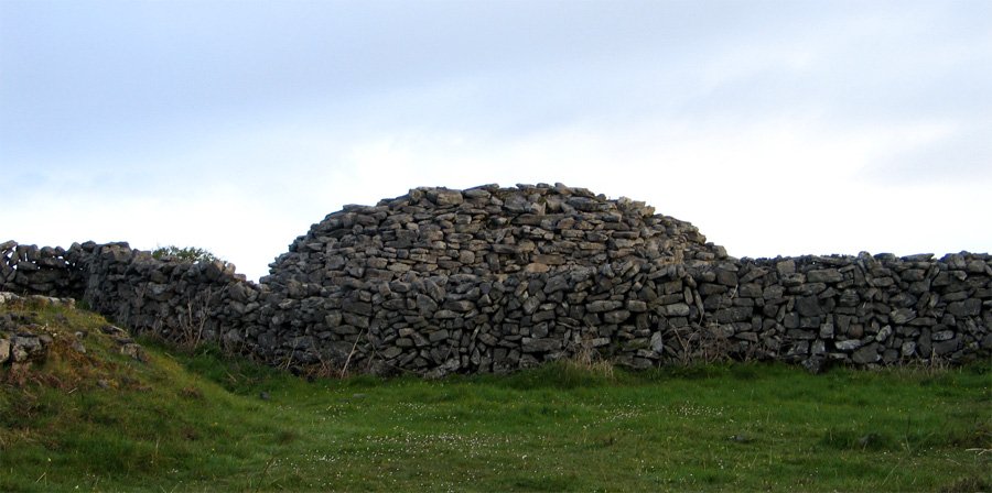 Clochan na Carraige is one of the best examples of a stone beehive hut in Ireland. Oval in shape on the outside, it has a corbelled roof and two opposite doorways to the northwest and southeast. Inside, it is rectangular with a small window on one end.