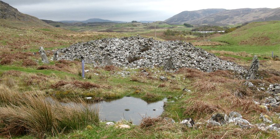 The southern cairn, almost 240 feet long, is the most impressive of the two cairns. The chamber is divided into compartments by pairs of upright slabs. The similar but much more ruined cairn lies close by to the north.