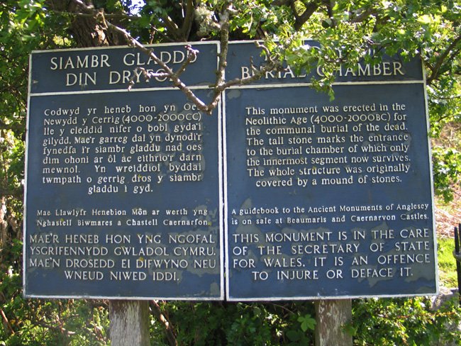Signs in Welsh and English at Din Dryfol Burial Chamber, Anglesey, Wales (J. Demetrescu 2009)