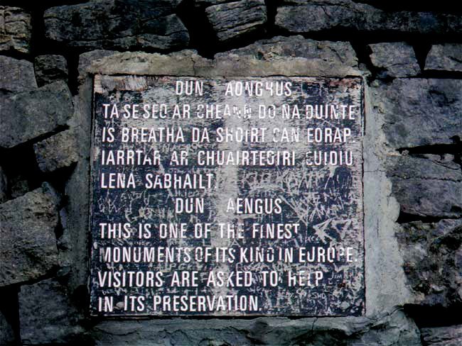 Sign in Gaelic and English at Entrance, Dun Aengus, County Galway, Ireland (Photo Scan by J. Demetrescu 2002)