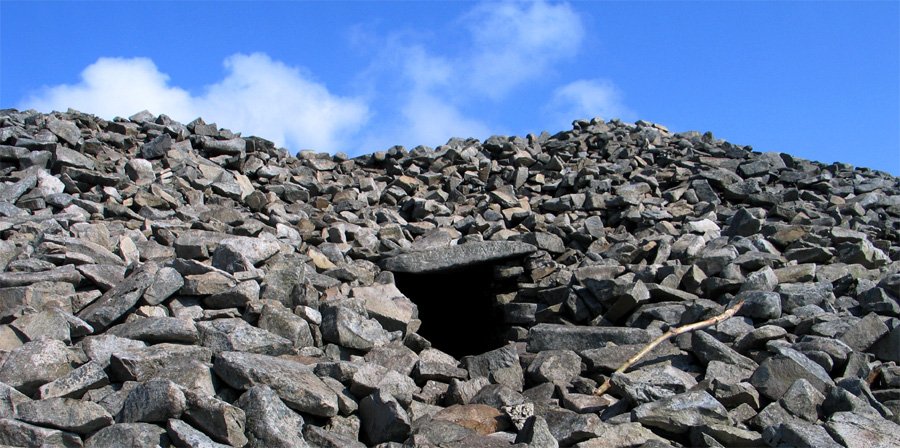 The South Cairn is on the southern summit of Slieve Gullion (Sliabb gCullinn). It is a large stone cairn, which covers a Neolithic passage tomb, similar in plan to Newgrange. Located at a height of almost 1900 feet, it is believed to be the highest surviving passage tomb in Ireland.