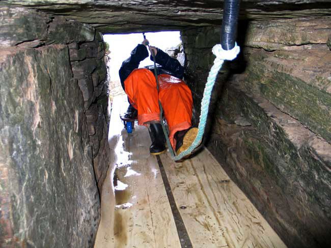 Entering the Cairn on the Infamous Trolley, Isbister (Tomb of the Eagles), South Ronaldsay, Orkney, Scotland (J. Demetrescu 2007)