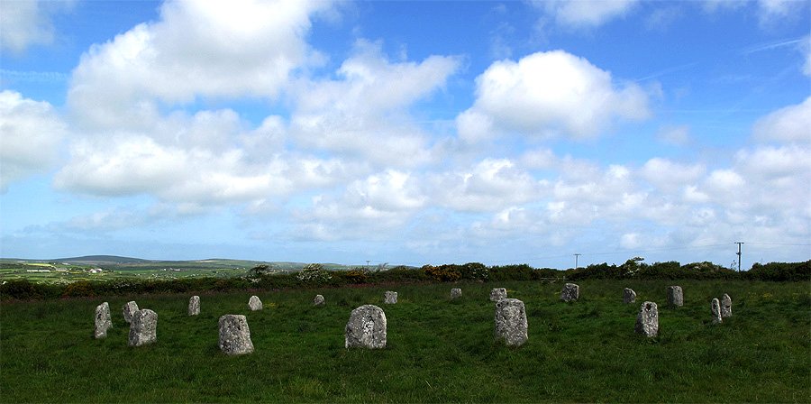 The Merry Maidens is a complete late Neolithic stone circle comprised of 19 granite megaliths situated in a field alongside a minor road. The circle is almost 80 feet in diameter with the tallest stone standing approximately 4-1/2 feet tall. Stones are regularly spaced around the circle with a gap or entrance at its exact most easterly point.
