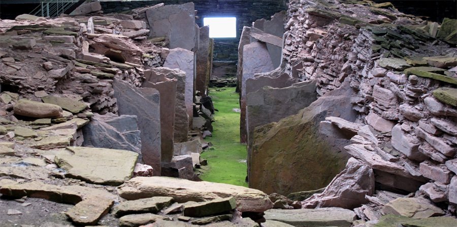 Originally built ca.3500 B.C. and discovered in 1932 by a landowner, the huge Midhowe Chambered Cairn is over 75 feet long and is divided by pairs of upright slabs into 12 compartments, several of which contained stone benches. The remains of 25 people were found in the compartments, and pottery was also recovered.