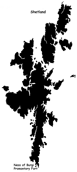 The Ness of Burgi Blockhouse Fort is located at the southern end of Scat Ness at the southern tip of the South Mainland and on the west side of the West Voe of Sumburgh. Exit the A970 for Scatness and continue south to the end of the road and walk from there. Access is not easy due to the physical conditions on the Ness.