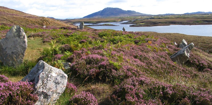 A truly marvelous setting, it overlooks Loch Langais and a number of other lochs. The highest mountain on North Uist, Ben Eval, is in the distance.