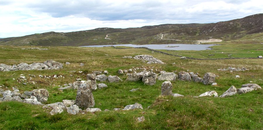 The largest house measures 16-1/2x23 feet and contains a central hearth surrounded by cells divided by orthostats. The house is represented by an oval, grass-covered bank. A gap in the southeast of the bank represents an entrance passage. Other features of the settlement include a circular cairn and two other identifiable dwellings.