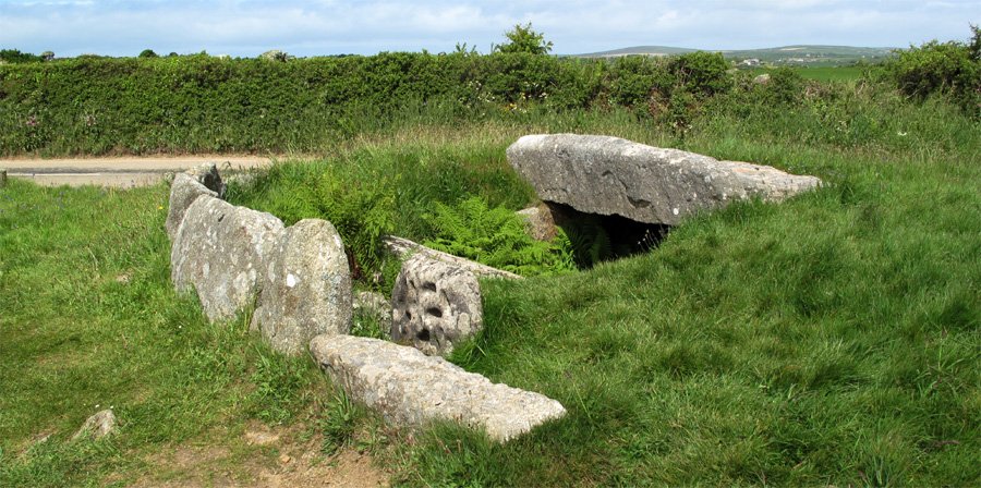 Tregiffian Barrow is a Neolithic or early Bronze Age barrow or entrance grave probably built sometime between 2000 and 3000 B.C. and composed of stone uprights, dry stone walling, and four (originally five) capstones. The northern half of the structure has been obliterated by the modern road.